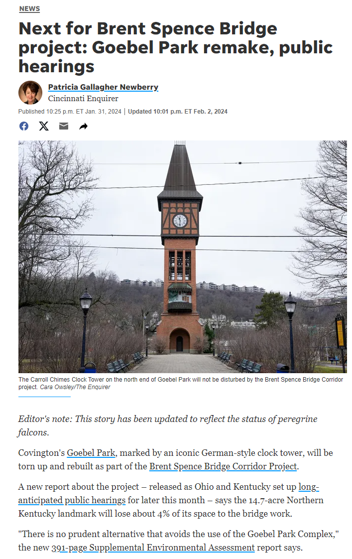"Next for Brent Spence Bridge project: Goebel Park remake, public hearings," Patricia Gallagher Newberry, Cincinnati Enquirer, Jan. 31, 2024
