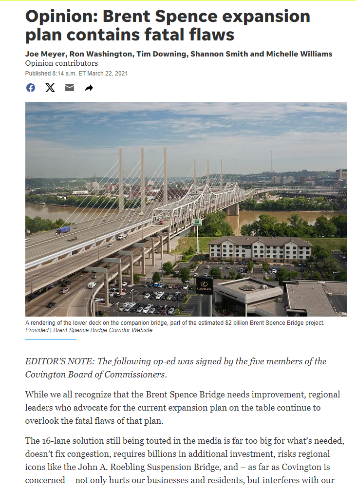 "Opinion: Brent Spence expansion plan contains fatal flaws," Cincinnati Enquirer, March 22, 2021